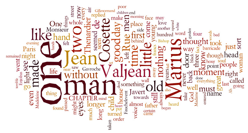 A word cloud of the whole text of the Brick (trans. Hapgood). These are the 150 most common words (minus the/and/was…), with the biggest ones being the most common.