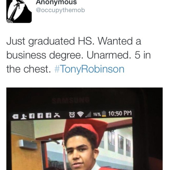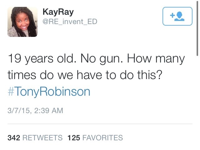 19-year-old unarmed teen, Tony Robinson, was shot and killed by police in Madison, Wisconsin last Friday night. According to several news sources, Madison Police Chief Koval said they received calls looking for a man who had committed battery and was jumping in and out of traffic One of the police officers, Matthew Kenny, spotted Tony and then proceeded to follow him into his apartment and forced his way in after claiming to “hear a disturbance inside”. the unarmed teen then “got into an altercation” with the Officer who then shot him 5 times in the chest, and dragged him out to the street while he bled out. He was later rushed to the hospital where he later died.