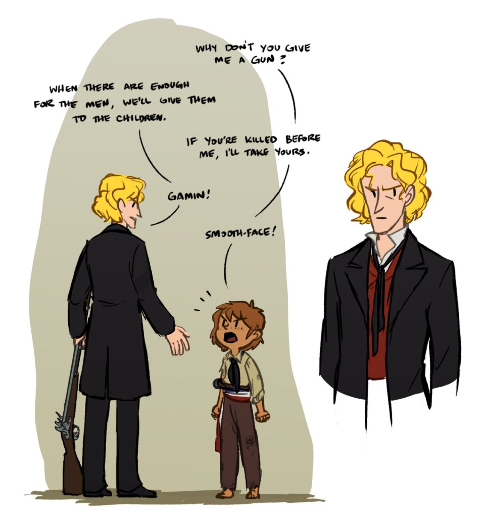 I’m glad you have fun drawing Gavroche, because I cannot get over your design for him! HIS TINY LITTLE FEET AND HIS POSTURE AND EVERYTHING he’s such a high-power engine of destruction and it’s GREAT.