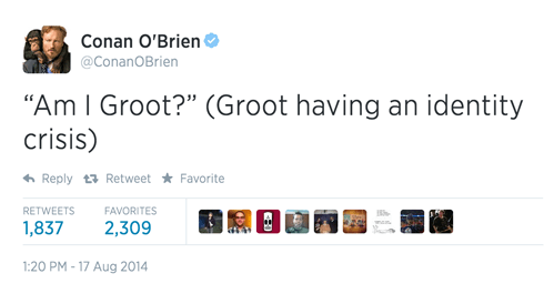 August 20, 2014 Overly Devoted Archivist Uncategorized guardians of the galaxy, heh 0 Comments tastefullyoffensive: [@conanobrien] Share this: Share on X (Opens in new window) X Share on Facebook (Opens in new window) Facebook Like this:Like Loading...