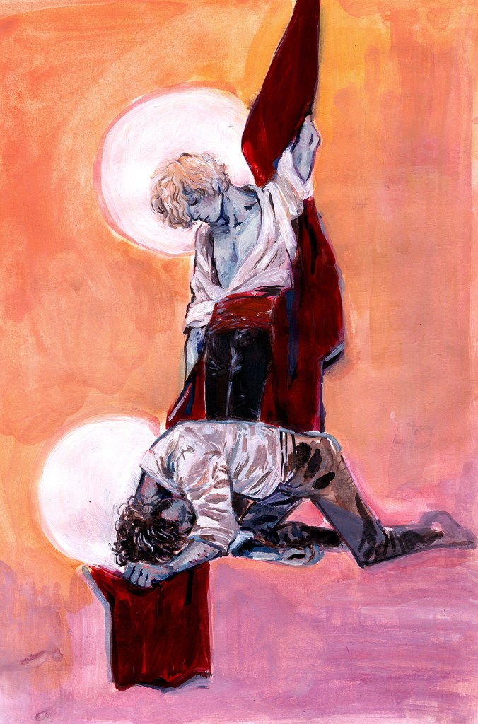 — Faites-en deux d’un coup, dit-il. Et, se tournant vers Enjolras avec douceur, il lui dit: — Permets-tu ? Enjolras lui serra la main en souriant. Ce sourire n’était pas achevé que la détonation éclata. Enjolras, traversé de huit coups de feu, resta adossé au mur comme si les balles l’y eussent cloué. Seulement il pencha la tête. Grantaire, foudroyé, s’abattit à ses pieds.