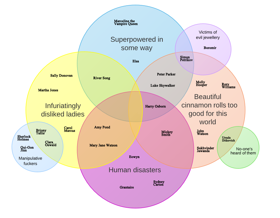 February 26, 2015 Overly Devoted Archivist Uncategorized 1 Comment Instead of doing anything productive today I made a Venn diagram of my favourite characters Share this: Share on X (Opens in new window) X Share on Facebook (Opens in new window) Facebook Like this:Like Loading...
