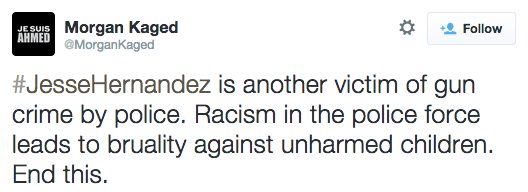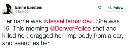 Brown Lives Matter (1/27/15): The police have done it again. They have taken the life on another unarmed teenager, this time a 16-year old girl by the name of Jesse Hernandez. After shooting her multiple times, they dragged her lifeless body out the car and proceeded to cuff and search her, rather than seek medical attention. The death harkens back to another young, unarmed Latin@ the Denver police killed last year, Ryan Roquillo. The officer in that death was eventually cleared. Prayers for peace and justice to this young girl’s family. #staywoke #farfromover