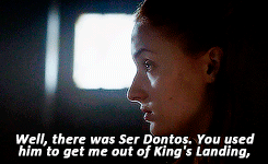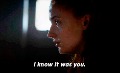 But Sansa’s survival has hinged entirely on her own skill, on her own ability to seem harmless and biddable and stupid – because she’s had absolutely no luck whatsoever for the past two and a half seasons. She’s already learned the brutal lesson by now that no true knight is going to come and take her away from this – the scene with her and Sandor during the Battle of the Blackwater showed that characterization brilliantly – and that it’s up to her to survive without friends and without hope. And so she has, beautifully. She’s kept her mouth shut and played her part and done as she’s been told – and better yet, she’s fooled those in power into thinking that she does it because she doesn’t know any better, when in reality she’s only pretending to be the girl who still believes in chivalry and romance.