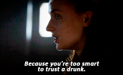 Because that’s par for the course for this girl. This is the girl who, after having been beaten by her own fiance’s guards for his amusement, crawled to her feet and announced that her loyalty lay with her fiance, her true love. And Tyrion – one of the most brilliant political operatives in Westeros – replied, “Lady Stark, you may yet outlive us all.” This is the girl who understood that by helping her husband retrieve a goblet from under a table, she was defying a king – and who was willing to do that for her husband. This is the girl who has found the only place in King’s Landing where she can be alone and still knows that it’s unsafe. This is a smart, smart girl, whose mistakes thus far have been due entirely to ignorance and inexperience. She’s learning fast, though, and I can’t wait to see what happens next.