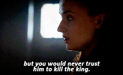 UGH SANSA MY OWN MY LOVE MY BESTIE. Seriously, the thing that so much of fandom doesn’t seem to fucking get about Sansa is that all the brains in the Stark family went to Sansa (and possibly a little bit to Bran). Ned was an honorable man, Robb was a good military commander, Jon is shaping up to be a good leader, Arya’s a ruthless badass, Bran thinks that wandering around the woods for two years is a good plan, and Rickon is four so who knows about him, and Cat, marrying into the family, got infected with the dreaded Stark Good Intention Bad Execution Fever. All of them are lovely, wonderful, noble, beautiful dumbasses.