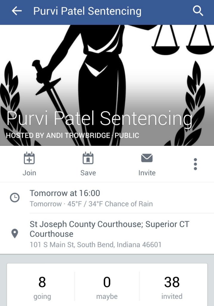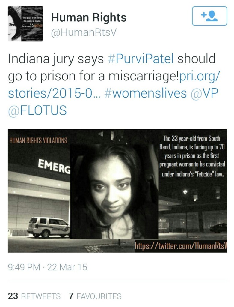I want people to start talking about this. I want them to know that this young woman of color is facing up to 70 years in prison based on contradictory charges. I want you all to be outraged over the fact that there were no abortion drugs found in her system but they are accusing her of feticide. I want your outrage over the fact that a method from the 17th century that is no longer used for being unreliable was used to determine if her fetus lived. I want your outrage over the fact that the court is treating that method as valid proof. I want your outrage over the racial profiling and targeting of the victim, and I am calling Purvi a victim because that is what she is. They are trying to make an example of her and that should not stand. I want more people talking about her case and I want your outrage over the fact that only 8 people will be attending the “protest” for her. Tomorrow is her sentencing. I do not want her to be alone.
