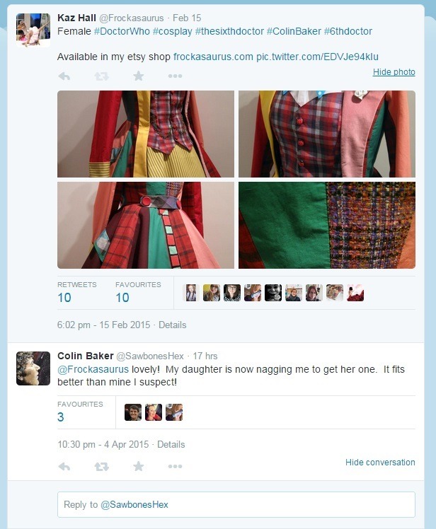 April 25, 2015 Overly Devoted Archivist Uncategorized awwww, colin baker, doctor who 0 Comments geeneelee: frockasaurus: The 6th Doctor himself approves of my femme 6th cosplay – and has just contacted me on Twitter asking to direct message me possibly regarding making one for his daughter… bloomin’ eck! This is the most adorable thing I’ve seen all day. ):| Share this: Share on X (Opens in new window) X Share on Facebook (Opens in new window) Facebook Like this:Like Loading...