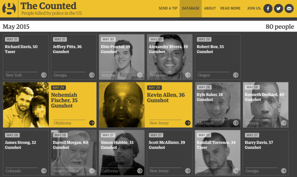 The Counted is a project by the Guardian – and you – working to count the number of people killed by police and other law enforcement agencies in the United States in 2015, to monitor their demographics, and to tell the stories of how they died.