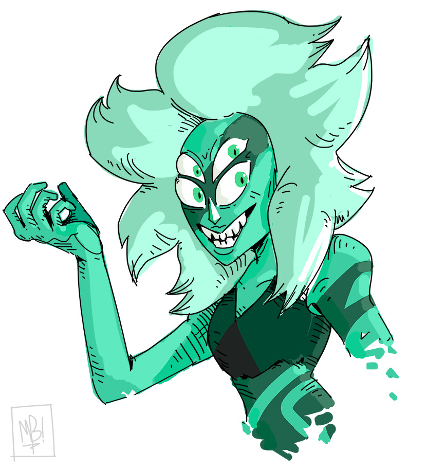Malachite! Dang, a villain worthy of a show as awesome as Steven Universe! A fusion of Lapis Lazuli and Jasper!! A villain we can all get behind!! Well, not get behind exactly. More like run away from real fast. And I guess only half of her is a villain. STILL. I love her design, and I wanted her to look really unstable