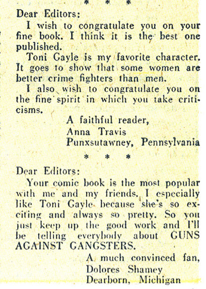 Letters from female readers praising “Toni Gayle,” printed in Guns Against Gangsters (1948-1949).