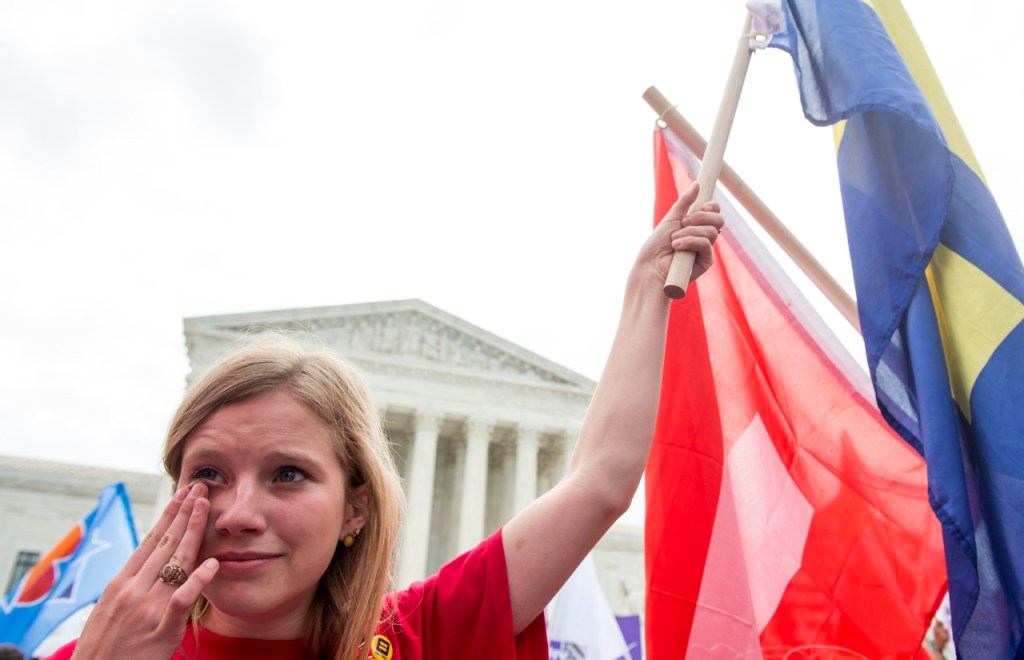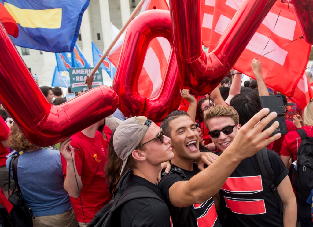 Washington DC – Same-sex marriage supporters take a selfie in front of the Supreme Court as they wait for the court to legalize same-sex marriages nationwide on Friday, June 26, 2015. In a 5-4 decision, the US Supreme Court legalized gay marriage nationwide, citing the constitutions equal protection clause as their rational. Justice Anthony M. Kennedy wrote the majority opinion: “No union is more profound than marriage, for it embodies the highest ideals of love, fidelity, devotion, sacrifice, and family,” he wrote. “In forming a marital union, two people become something greater than once they were.”