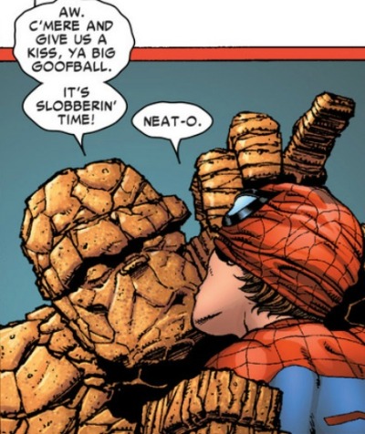 To those who doubt a spideypool kiss could happen in the Spider-Man/Deadpool book, I would like to remind you that Peter and Ben Grimm once made out and nobody reacted.