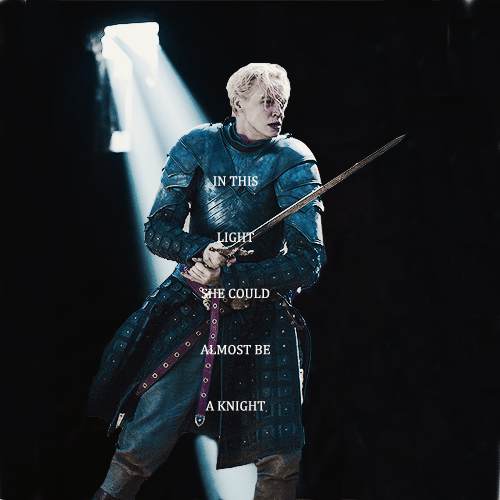 July 20, 2015 Overly Devoted Archivist Uncategorized brienne, game of thrones 0 Comments ladyblackfish: “The light was so dim that Jaime could scarcely see her, though they stood a scant few feet apart. ‘In this light she could almost be a beauty’, he thought. ‘In this light she could almost be a knight’.” Share this: Share on X (Opens in new window) X Share on Facebook (Opens in new window) Facebook Like this:Like Loading...