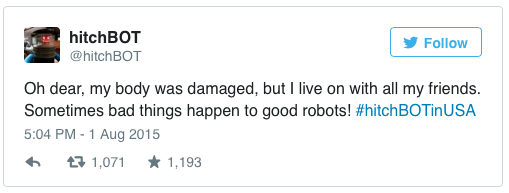 This is why we can’t have nice things. On Saturday, vandals in Philadelphia destroyed a hitchhiking robot from Canada named HitchBot, two weeks into its U.S. trip. Designed as a social experiment, HitchBot could talk to humans and upload photos to social media. If you found it, HitchBot would tell you where it wanted to go and ask for a ride. Worry not though, HitchBot may get a happy ending.