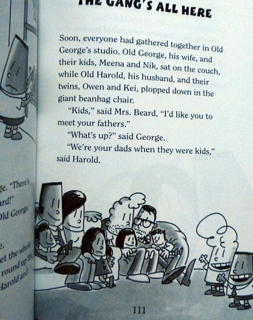 context is that harold and george have gone to the future to meet their adult selves; old george has a wife, and old harold has a husband. old george’s wife, mrs. beard, is introducing her children and the other couple’s children to george and harold, their respective fathers.