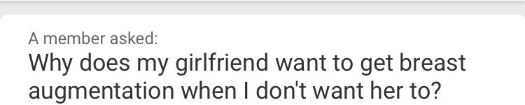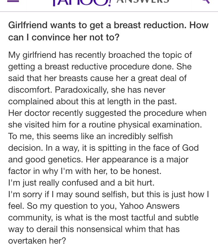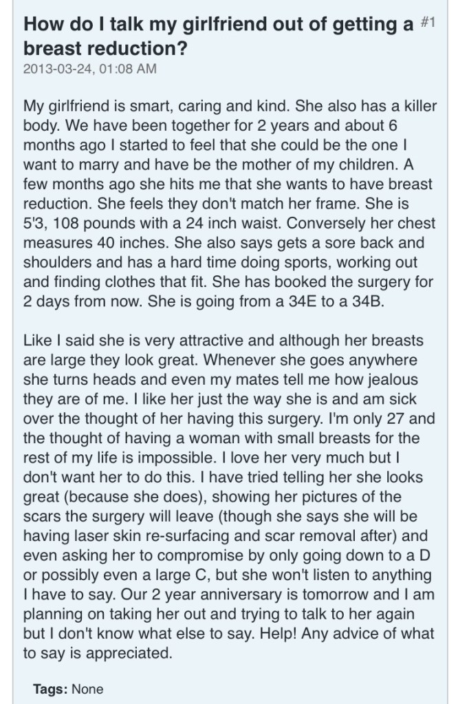 “I’m only 27 and the thought of having a woman with small breasts for the rest of my life is impossible”So you’ve been with a guy two years, mention you’re thinking of getting a breast reduction, get all that fanfare and suddenly realise that guy was only with you for your boobs. I have no words.