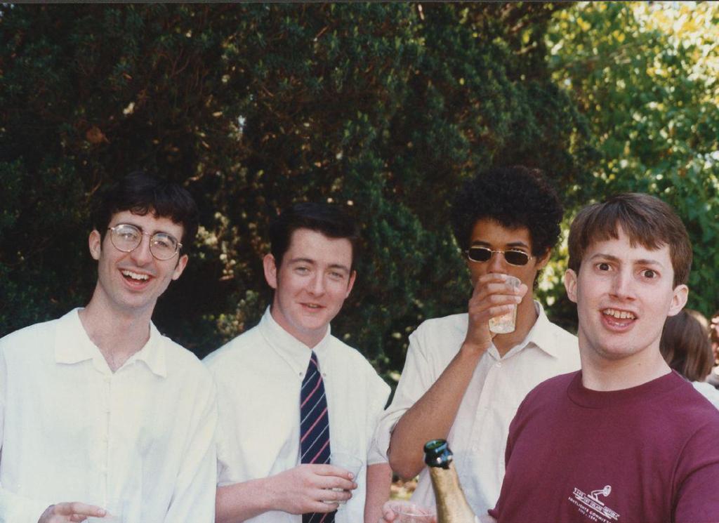 From left to right: John Oliver, unknown, Richard Ayoade and David Mitchell at the Footlights garden party.