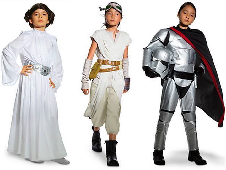 “Princess Leia, Rey, and Captain Phasma Star Wars fancy dress outfits, being sold at Disney Stores”