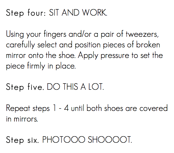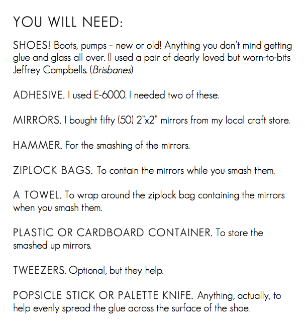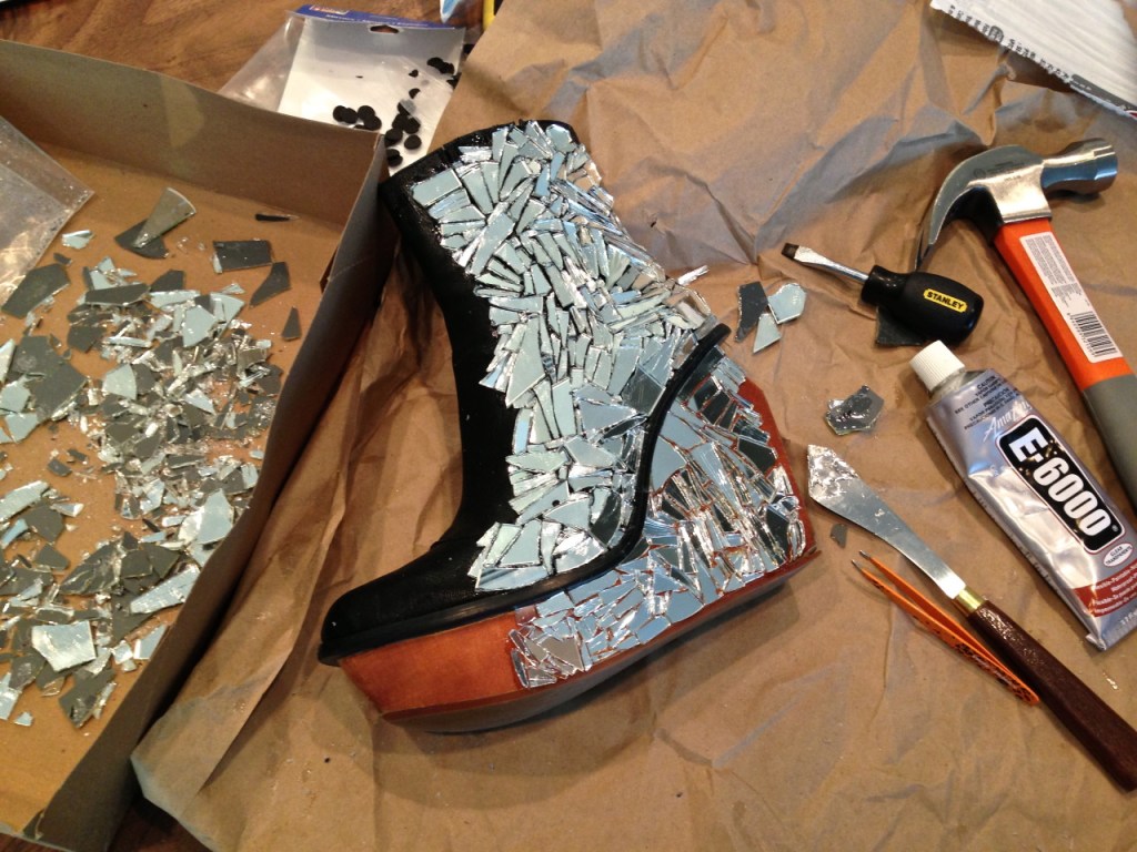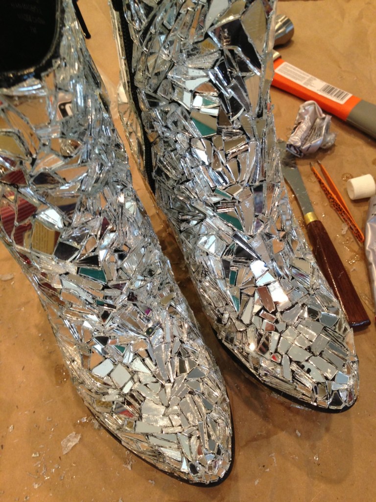 I created these boots using a pair of dearly loved but worn-to-bits Jeffrey Campbells (Brisbanes – original here), about 50 broken mirrors (purchased from my local craft store), and some really intense adhesive.