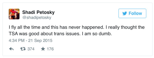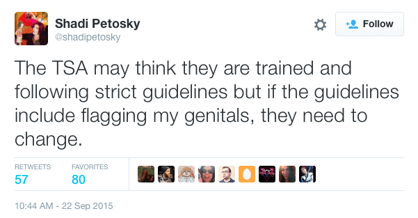 Shadi Petosky just wanted out of Orlando, Florida. On Monday night, Petosky, a 35-year-old transgender woman, attempted to board a flight at Orlando’s International Airport when she was detained by the TSA. The reason? An “anomaly” — her genitals. The TSA does have a policy for treating trans fliers, but there’s just one problem with it.