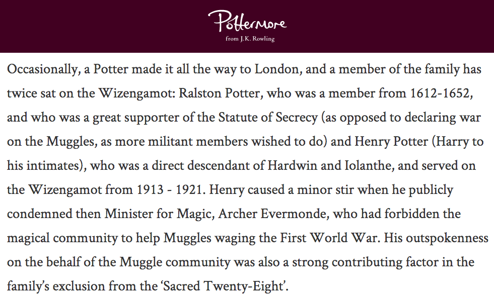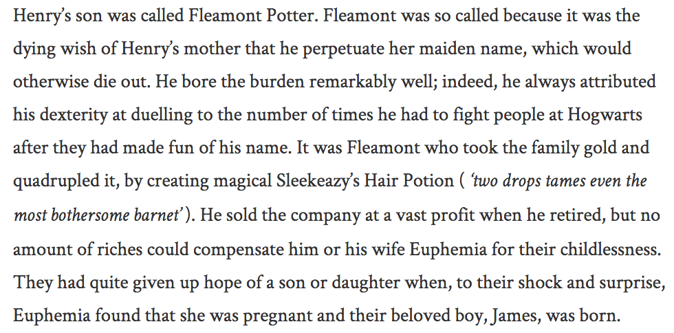Harry’s relatives have always advocated for muggle rights, his grandfather was called Fleamont and invented a potion for unruly hair that Hermione used for the Yule ball, and Harry was named after his great-grandfather and this just makes me so emotional.