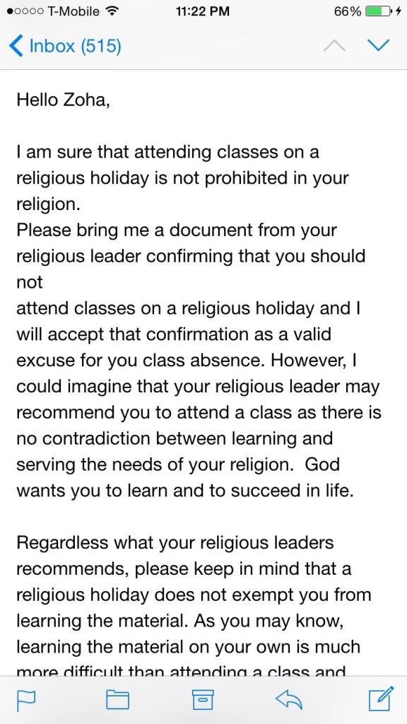 also how Christmas break is for getting together with relatives and celebrating but when it’s a Muslim holiday then it gets turned into the religion prohibiting a person from education