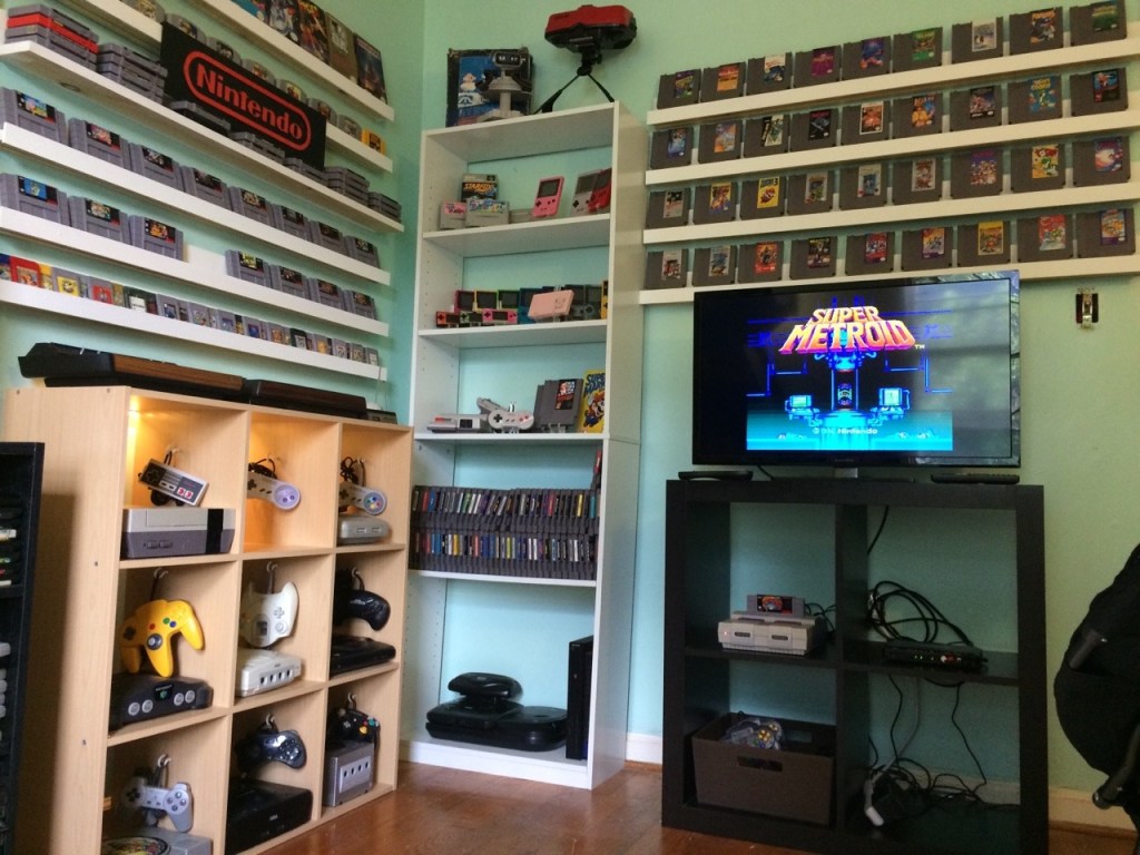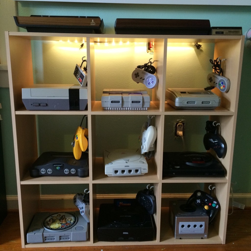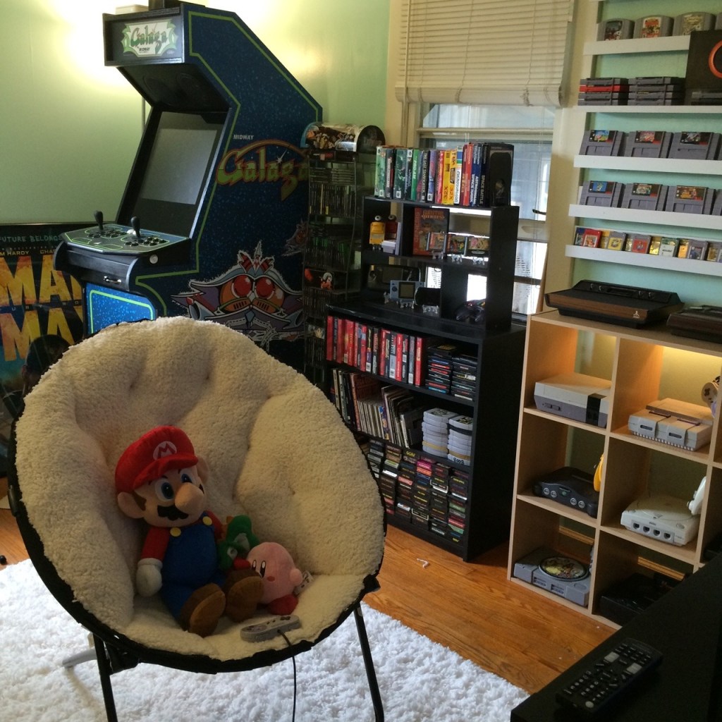23 different consoles and handhelds, about 450 old games. Framemeister xrgb-mini upscaler so it doesn’t look bad on a new tv, handmade custom MAME cabinet, and a fuzzy chair and fuzzy carpet :)