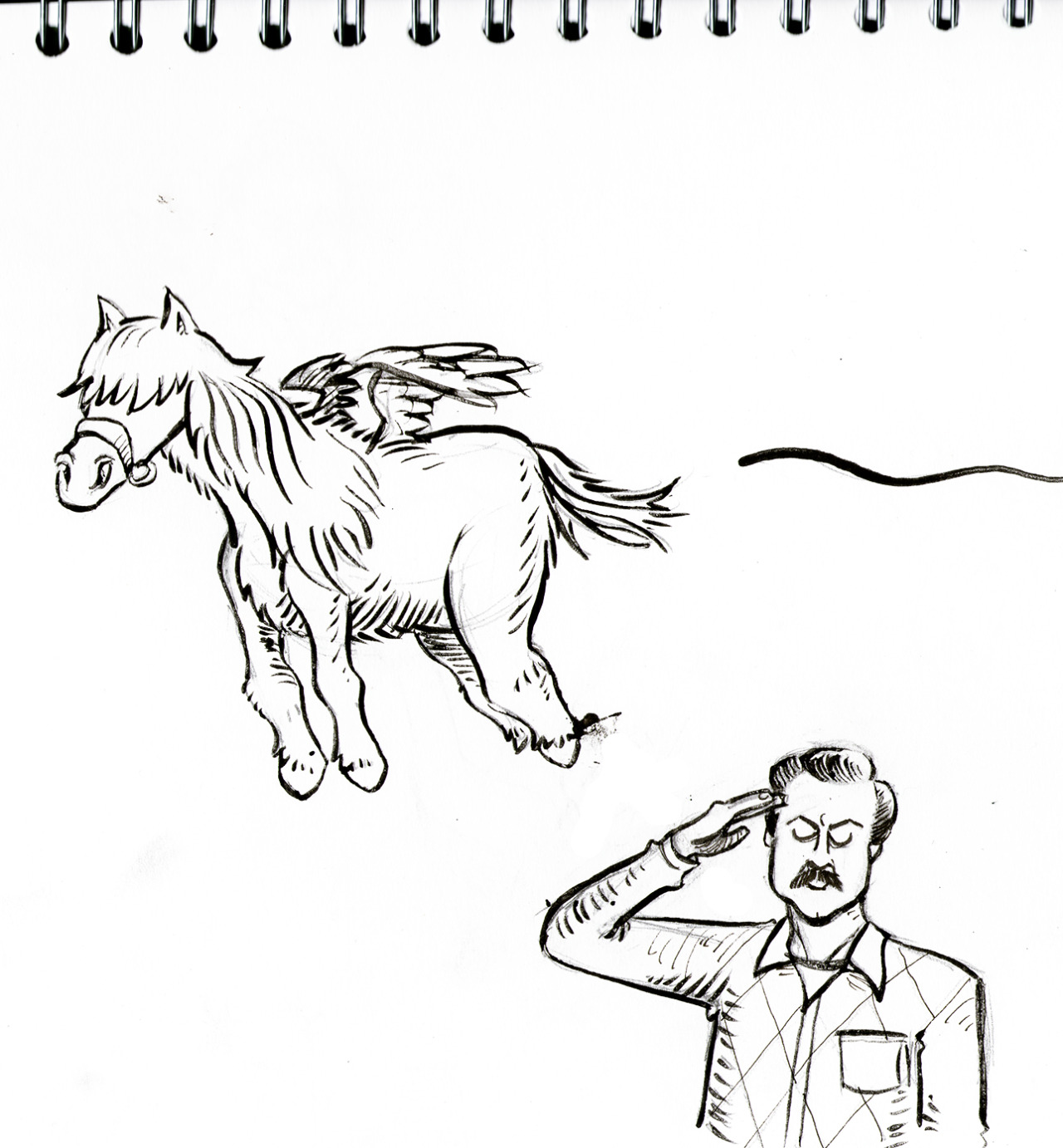INKTOBER: Day 11: NEVER FORGET: LIL’ SEBASTIAN. Ron offers a sincere salute, but dares not look upon the ghostly visage of such a wonderful tiny horse; This is done at the request of my friend Dave (who takes astonishing photographs and puts them over at https://www.flickr.com/photos/126235057@N07/ , check them OUT)