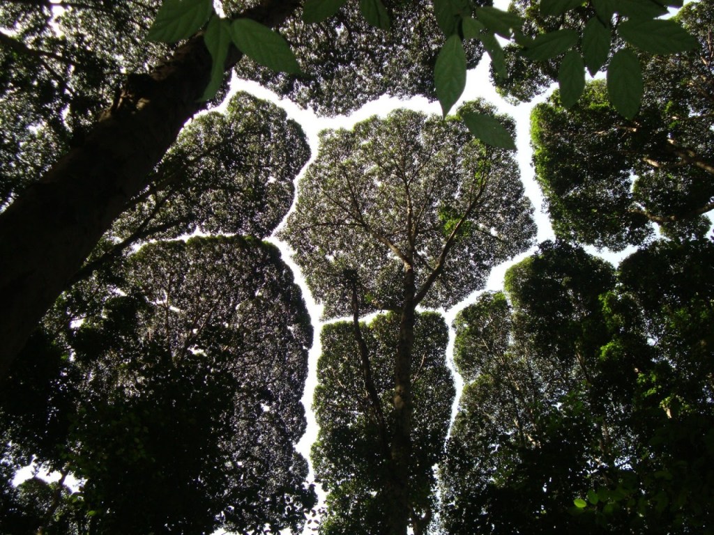 “Crown shyness is a phenomenon observed in some tree species, in which the crowns of fully stocked trees do not touch each other, forming a canopy with channel-like gaps.“