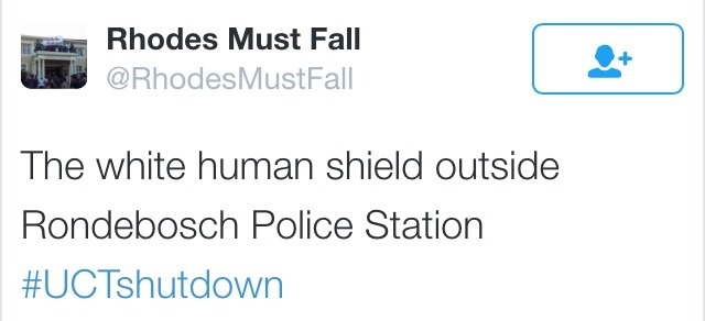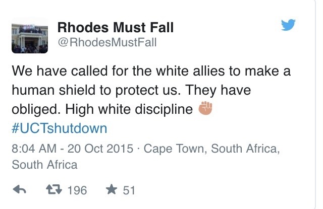THIS is how you ally. THIS is how you use your privilege to help us. THIS is how you earn our respect. The White college students in Cape Town, South Africa knew the police would not shoot or harm them so they created a human shield to protect the Black protestors. I’m crying. I’m crying.