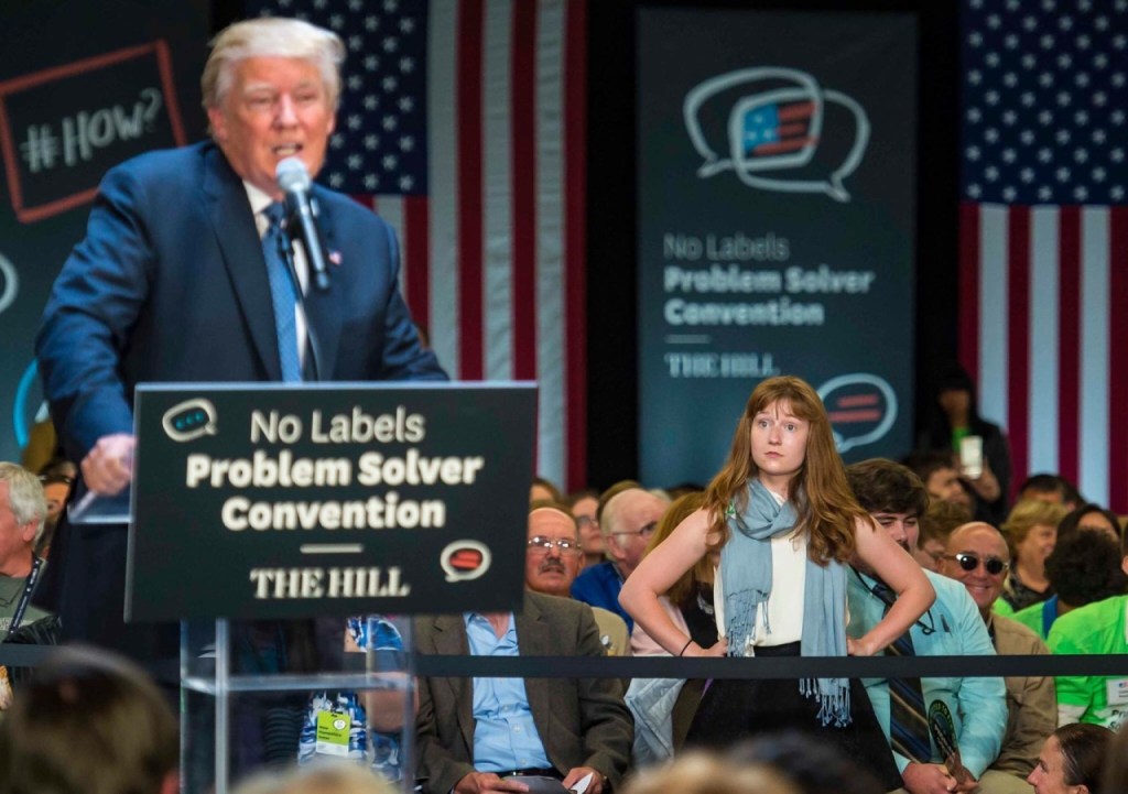 Lauren Batchelder of Chester N.H. waits for Donald Trump to stop talking after interrupting her and to continue with her question on women’s rights at the No Labels Problem Solver Convention in Manchester N.H. on Monday, October 12, 2015.