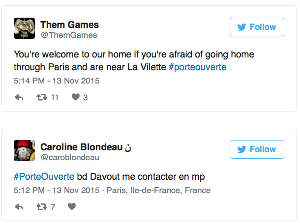 In the midst of a series of attacks in Paris on Friday night that have left at least 35 dead, some Twitter users in the city immediately began using the hashtag #PorteOuverte, or “open door,” to offer their homes as shelter for those afraid to be on the streets. This is incredible kindness in action.