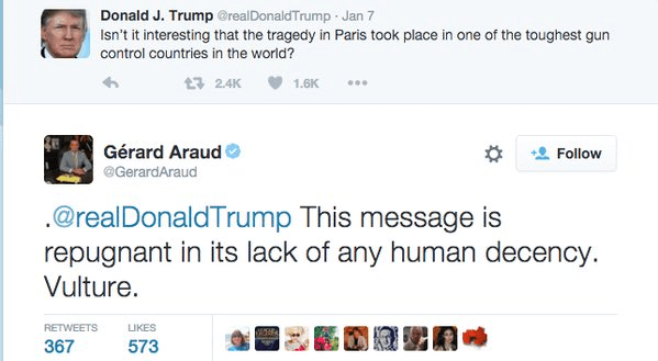 November 14, 2015 Overly Devoted Archivist Uncategorized 0 Comments ggwookie: That reply to Donald Trump is from Gérard Araud, who is the French Ambassador to the United States, based in Washington DC. Share this: Share on X (Opens in new window) X Share on Facebook (Opens in new window) Facebook Like this:Like Loading...