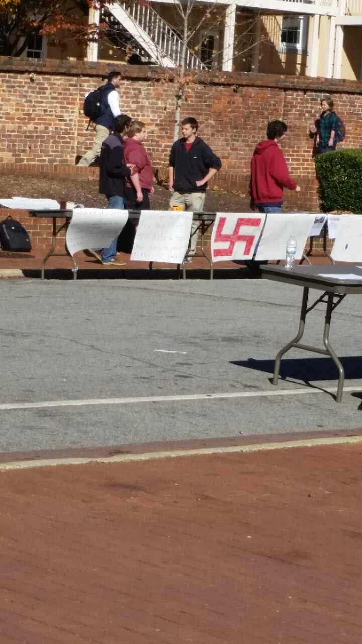 That’s a Nazi Swastika.I want it to be known that the University of South Carolina did not stop this. Multiple students, myself included, came forward, expressing feeling unsafe, or distaste and disgust and asked for its removal. The university defended their ability to fly a hate symbol that strikes fear and memories of horror into minority students – because they weren’t really Nazis, they were protestors arguing for “free speech” and “anti-censorship”.