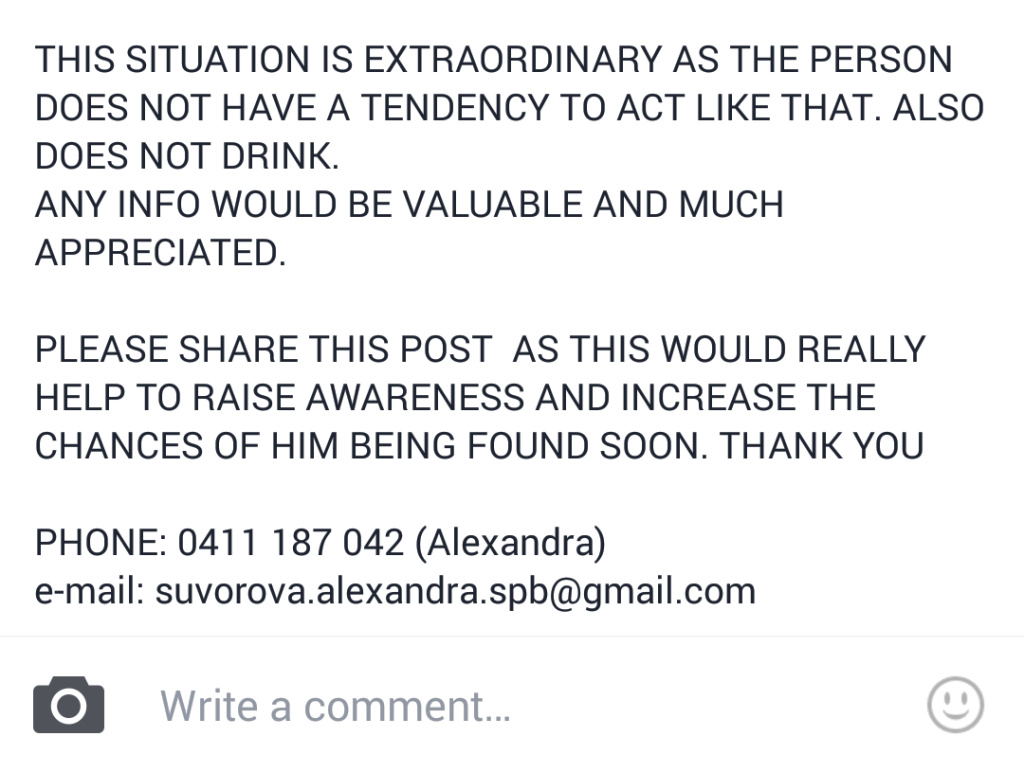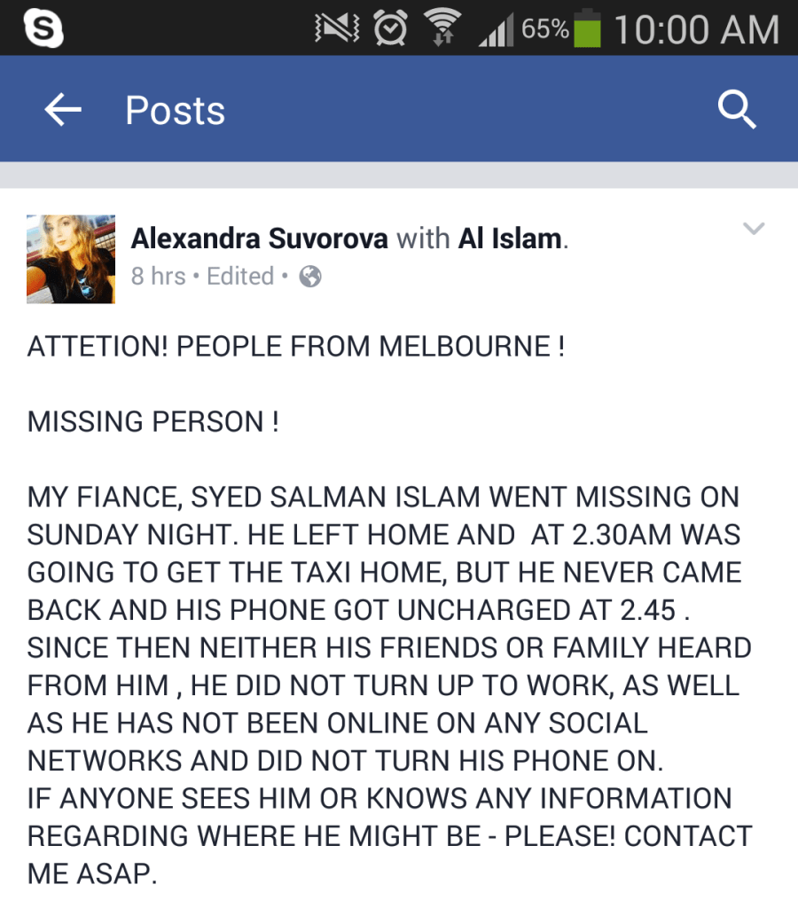 November 26, 2015 Overly Devoted Archivist Uncategorized 0 Comments fuckyeahloldemort: 091106: MY FRIEND HAS GONE MISSING HIS FINANCEE POSTED THIS AT 2AM ON THE 25TH OF NOVEMBER 2015 HIS BROTHER AND SISTER IN SYDNEY ARE WORRIED AS WELL AS HIS PARNETS IN BANGLADESH PLEASE SPREAD THIS Please spread this around Australians! Share this: Share on X (Opens in new window) X Share on Facebook (Opens in new window) Facebook Like this:Like Loading...