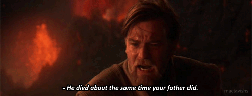 I just love this quote. It’s so easily overlooked, seen as unimportant, until you see the prequels. Because then you realize how utterly true and heartbreaking that phrase is. “He died about the same time your father did.” Meaning that Obi-Wan, that is, everything that made him who he was, his faith, his joy, his light, was murdered, killed, at the same time that Anakin was lost to the Dark Side. When Anakin became Vader, Obi-Wan became Ben. Anakin and Obi-Wan died together on that planet. Only Vader and Ben left it alive. One full of hate and darkness, the other a broken shell that was merely existing, not even really living. These two men were so deeply entwined, so bonded together in the force, that when one died, so did the other. That is the real definition of true love.