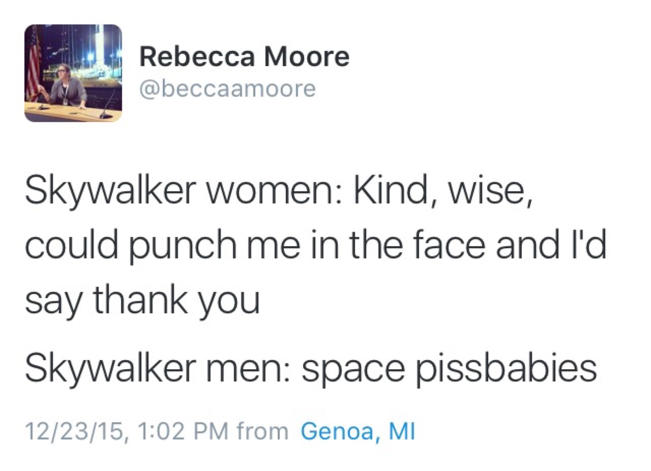 Although I don’t imagine we’ll know Luke’s precise motivation for essentially abandoning his family until the next episode arrives, he’s still a long way from ‘space pissbaby’ considering he walked to his death and threw his weapon away and saved his father and destroyed the Empire using nothing but LOVE (!!!!) Luke is frickin’ awesome