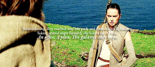 Whether motivated by her stare or by something unknown, the figure finally turned toward her and pulled back his hood. Luke Skywalker. His hair and beard were white, and his countenance was haunted. He did not speak, nor did she. Remembering, Rey reached into her pack and removed his lightsaber. Taking several steps forward, she held it out to him. An offer. A plea. The galaxy’s only hope. She wondered what would happen next.