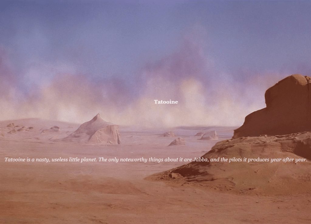 February 18, 2016 Overly Devoted Archivist Uncategorized star wars 0 Comments ptolemv: Star Wars Planets + Quotes about them Share this: Share on X (Opens in new window) X Share on Facebook (Opens in new window) Facebook Like this:Like Loading...