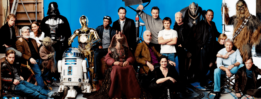 Grievous, Billy Dee Williams, Carrie Fisher, Harrison Ford, Peter Mayhew as Chewbacca, and Mark Hamill.