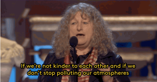 After showing up to the Oscars in a motorcycle jacket, #NoMakeUp, and au naturale hair, she went on stage to accept her award in the most casual way. All in all, she is all of us. “I really don’t do frocks and I absolutely don’t do heels,” Beavan told Refinery29.