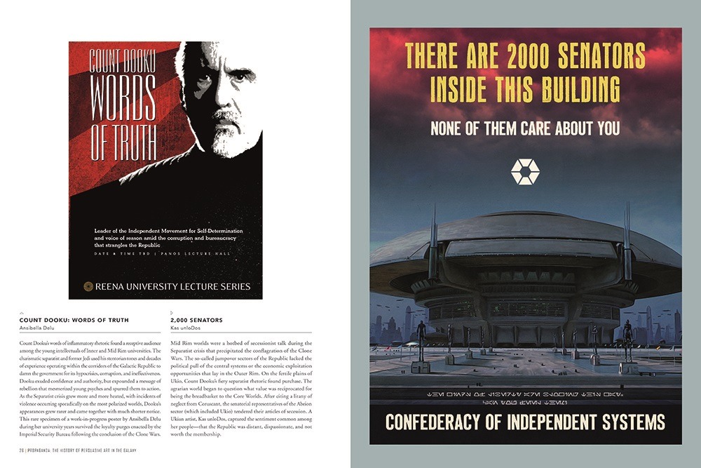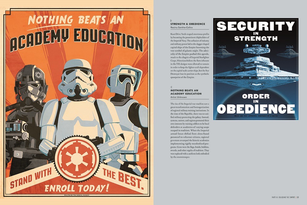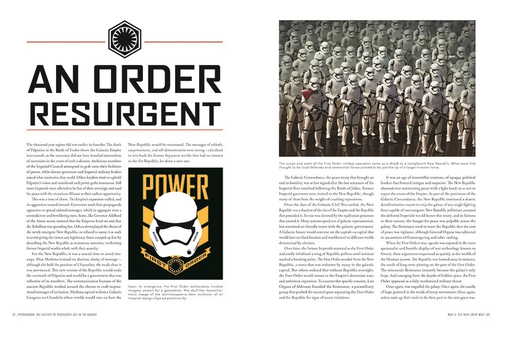 Sample pages from the upcoming Star Wars Propaganda: A History of Persuasive Art in the Galaxy book (written by Pablo Hidalgo) coming this fall. Both it and another book on the history of War in the Star Wars galaxy are written in an in-universe perspective and I wouldn’t be surprised if we see a ton more in-universe guide books in the coming years. I mean, it’s the perfect type of non-park exclusive item for populating the giftshops of Star Wars Land and I’m just a sucker for in-universe reference books in general.
