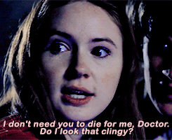 This right here, Amy’s tendency to push people away as soon as they get close to her, explicitly insulting them and herself for caring, is what always gets me. Even now, looking at this gifset, I get uncomfortable, because that’s me. As someone with abandonment issues, I work to keep people at a safe distance with sarcastic insults and somewhat standoffish behavior until I feel I can trust them. Amy does the same thing. Amy wants Rory to care for her, and she wants the Doctor to care for her, but the second she allows them to care for her, the second she lets them in, it’s all over. Her armor’s down and they can hurt her.