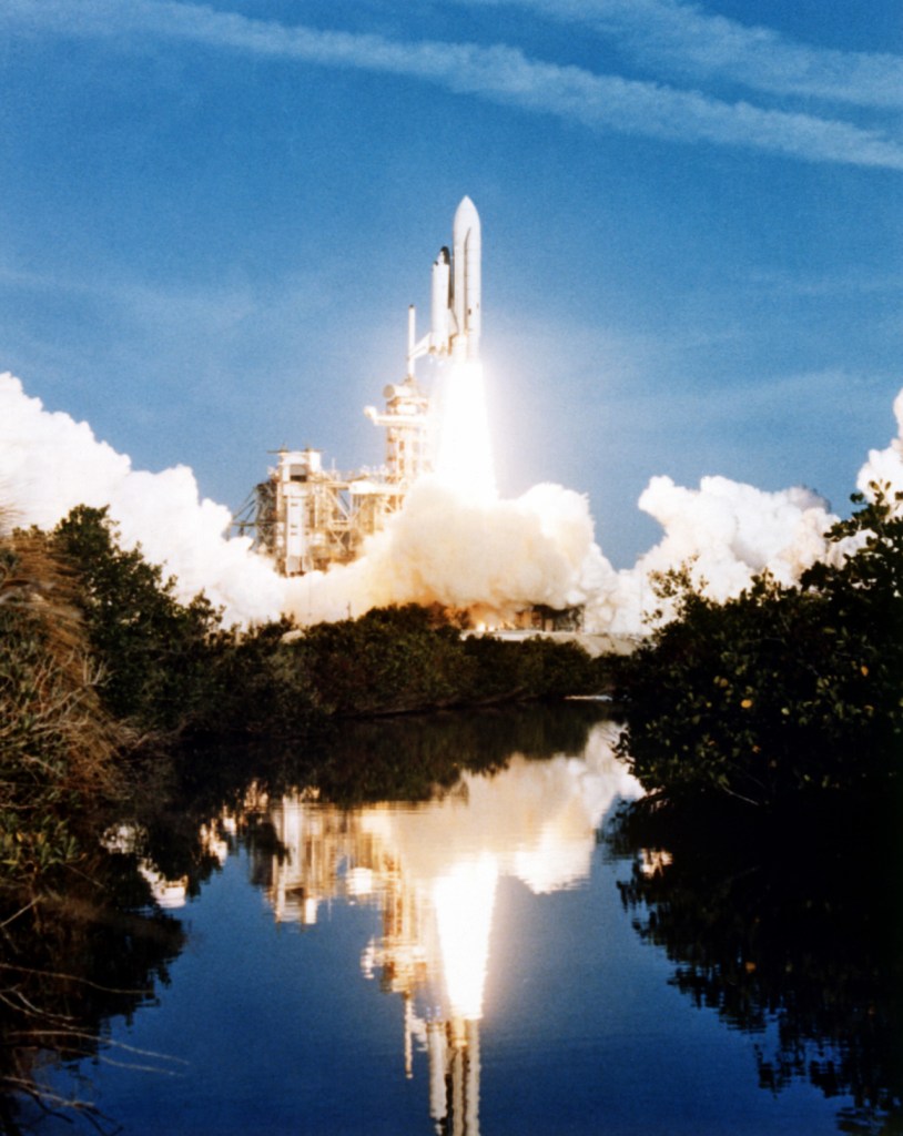 National Archives Identifier: 6347836The space shuttle orbiter Columbia is launched for the first space transportation system test mission. A lake (in the foreground) reflects the orbiter.