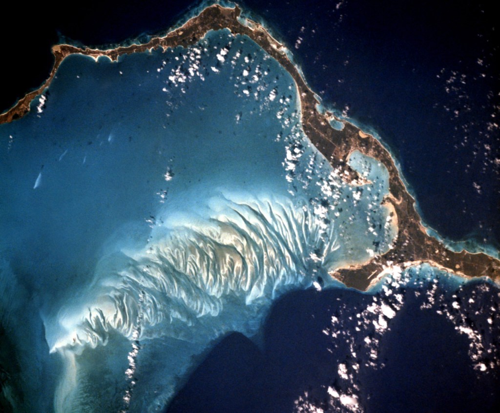 National Archives Identifier: 6347837Space photo of Bleuthera Island, in the Bahamas, and the part of the Bahama Bank. The photo was taken from the space shuttle orbiter Columbia during the first space transportation system test mission.
