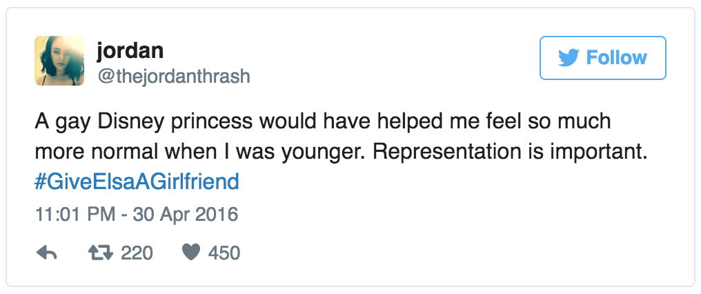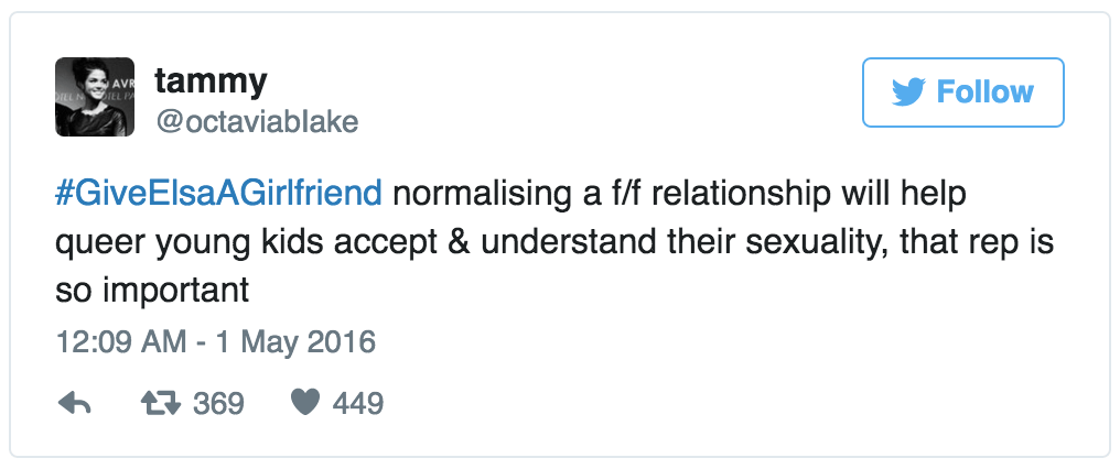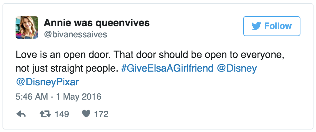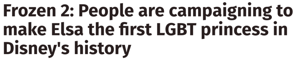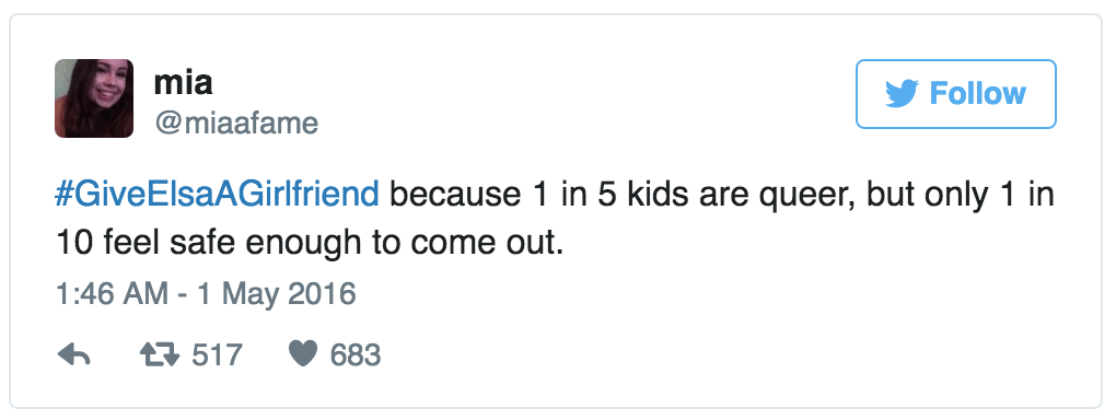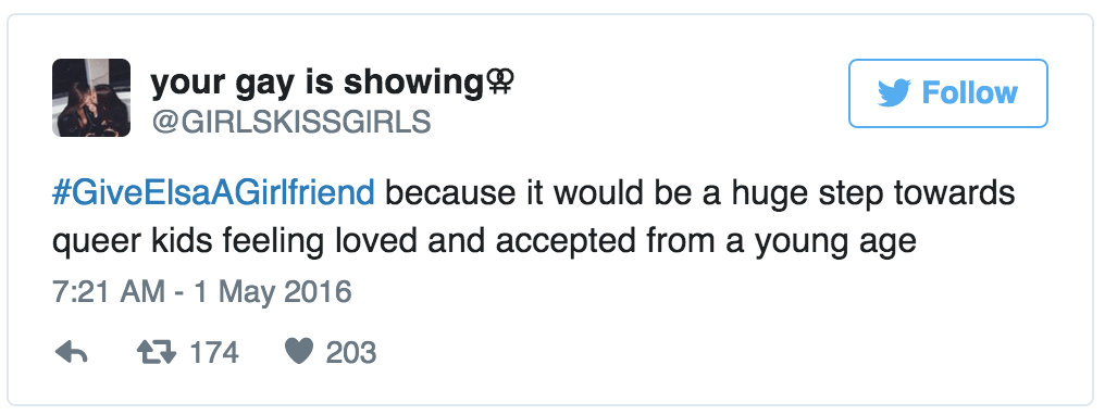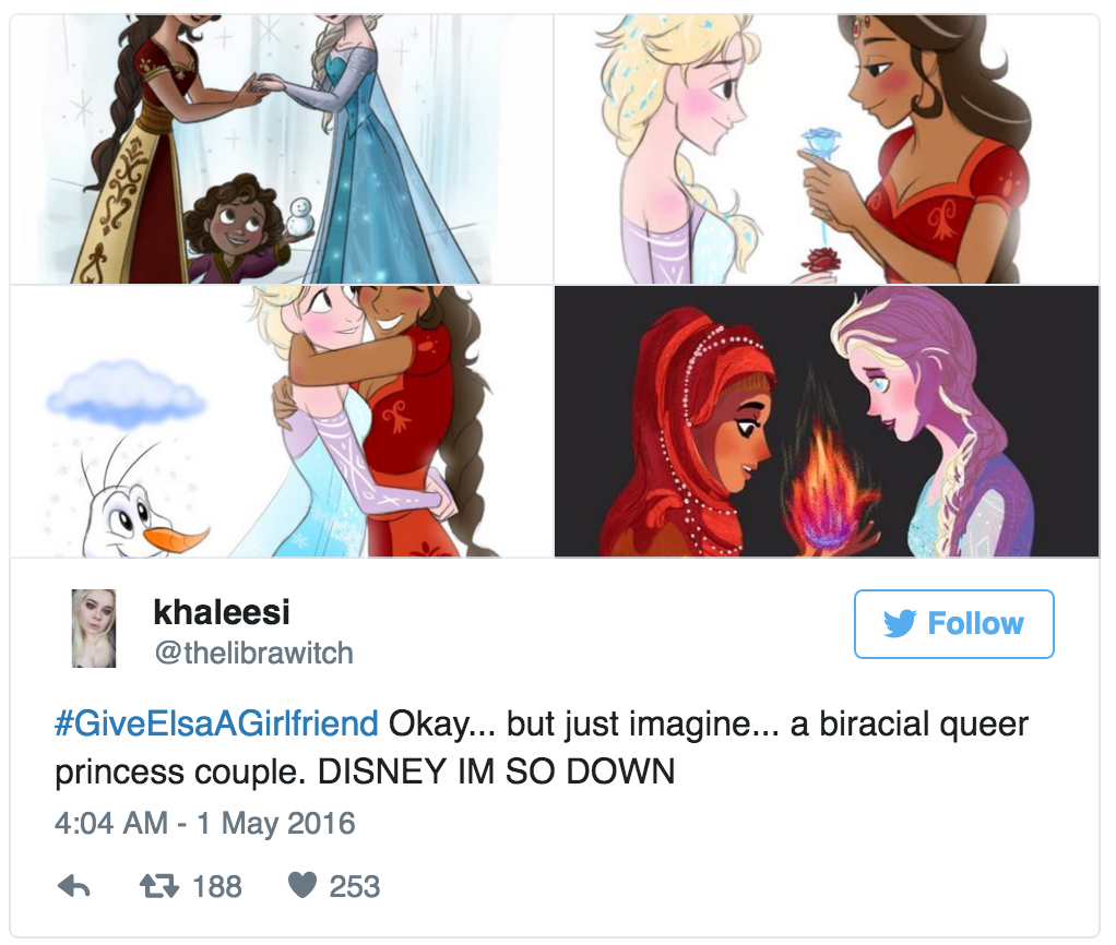 With the hashtag #GiveElsaAGirlfriend, Twitter users are campaigning for Frozen 2 to declare Elsa the first openly LGBT Disney princess. Sign me up. (via the Independent)
