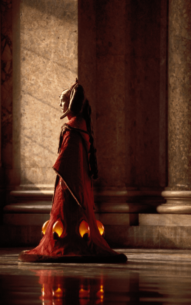when The Phantom Menace was filmed in 1999, the lights at the foot of the gown had to be powered by a car battery, which was carefully hidden between the actor’s legs during filming.