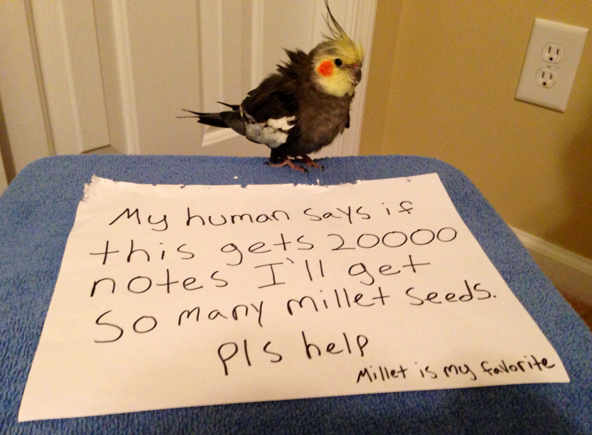 May 12, 2016 Overly Devoted Archivist Uncategorized awwww 0 Comments pepperandpals: pepperandpals: pepperandpals: Pls helb poof birb obtain millet seeb. Guess who’s getting millet later today. Share this: Share on X (Opens in new window) X Share on Facebook (Opens in new window) Facebook Like this:Like Loading...