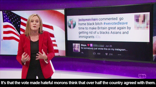 June 28, 2016 Overly Devoted Archivist Uncategorized uk 0 Comments sandandglass: Samantha Bee explains why the outcome of the Brexit referendum makes it even more important to reject Trump his racist sentiments in November Share this: Share on X (Opens in new window) X Share on Facebook (Opens in new window) Facebook Like this:Like Loading...